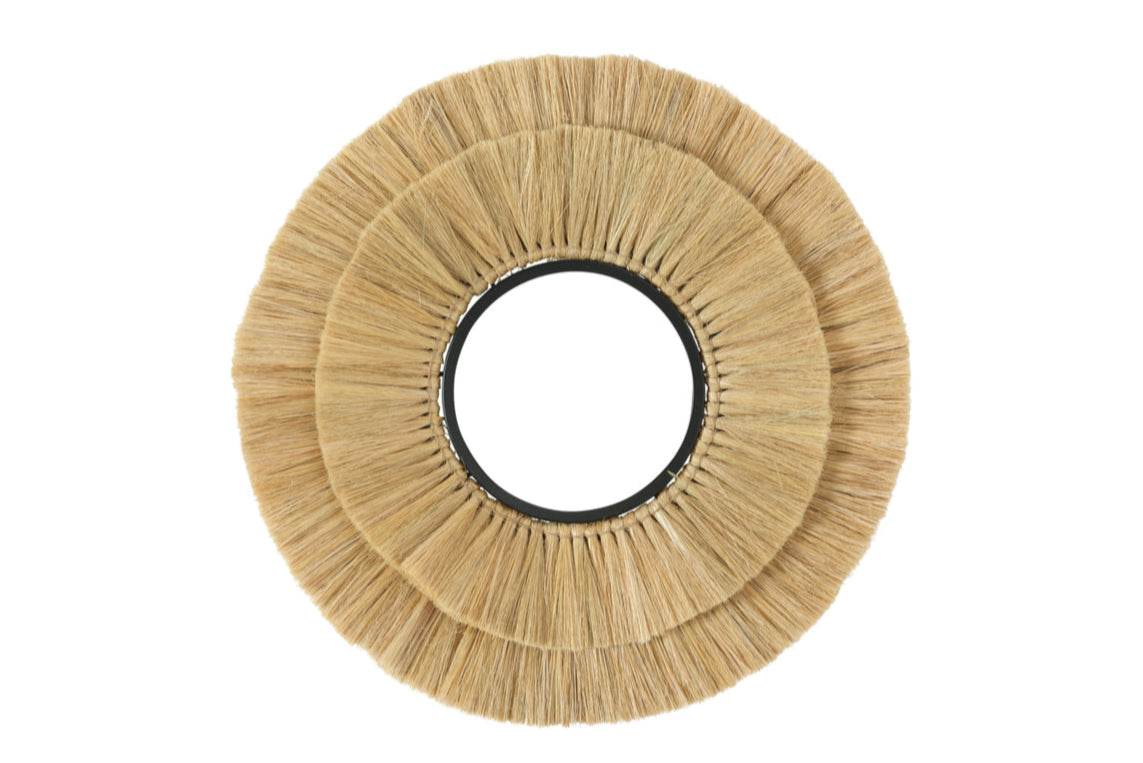 Instantly elevate any room in your home with this handmade straw rattan hanging mirror. Crafted with care and attention to detail, the round mirror seamlessly blends the warmth of nature with the elegance of artisan craftsmanship. This natural wall decor adds a touch of texture and minimalistic boho style to your space and serves as a decorative accent piece, perfect for your living room, bedroom, bathroom, and kid's room.